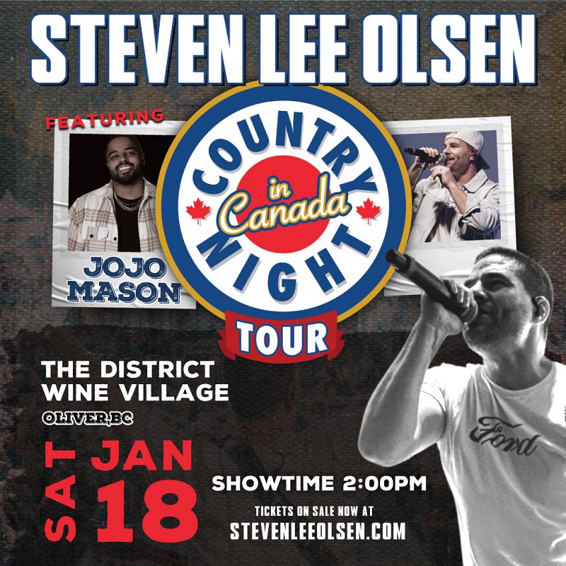 Join us for our first OUTDOOR WINTER CONCERT at the District Wine Village! The Country Night in Canada Tour with Steven Lee Olson featuring JoJo Mason is on tour and we are on the route!! Date | Saturday, January 18, 2025 Time | 2:00pm Price | $69 GA | $75 PATIO With over 80 million global str